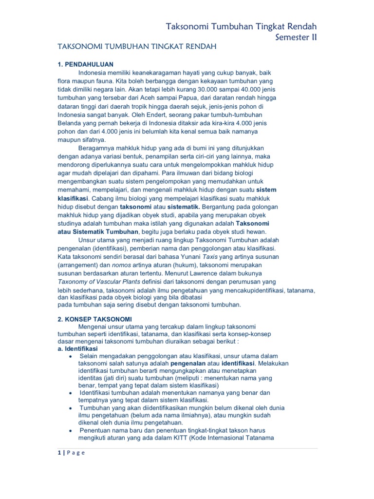 Lichenes (lumut kerak), yaitu simbiosis antara algae dengan fungi d. Siti fatimatus zahro (161510501204) program studi agroteknologi fakultas pertanian universitas jember 2017 bab 1. V belum mempunyai jaringan pengangkutan. Sehingga sistematika yang kami pelajari yaitu sistematika tumbuhan cryptogamae. Pokok utama pembahasan dalam buku ini adalah tentang pengantar taksonomi tumbuhan dan tata cara penulisan nama ilmiah tumbuhan serta keanekaragaman tumbuhan dari tingkat rendah yang bersel satu. Taksonomi tumbuhan rendah tatanama tumbuhan unsur utama yang menjadi ruang lingkup taksonomi tumbuhan adalah pengenalan (identifikasi), pemberian nama dan penggolongan atau klasifikasi. Mahasiswa memperoleh pengalaman langsung, baik di lapangan maupun dalam pembuatan laporan. Pengertian tingkatan takson, klasifikasi, hewan dan tumbuhan adalah tingkatan unit atau juga kelompok makhluk hidup yang disusun yang di mulai pada tingkat tertinggi hingga tingkat terendah. Termasuk kedalam organisme multiseluler dan eukariotik organ tubuh sudah berupa Tumbuhan tingkat rendah yang ada pada saat praktikum antara lain (saccharomyces, jamur ganoderma, paku fertil, lumut). Saudara mahasiswa, setelah anda mempelajari materi sesi 3, silakan kemukakan pendapat anda dalam forum Taksonomi dapat diartikan sebagai pengelompokan suatu hal berdasarkan hierarki (tingkatan) tertentu. Welcome to repositori universitas kristen indonesia.